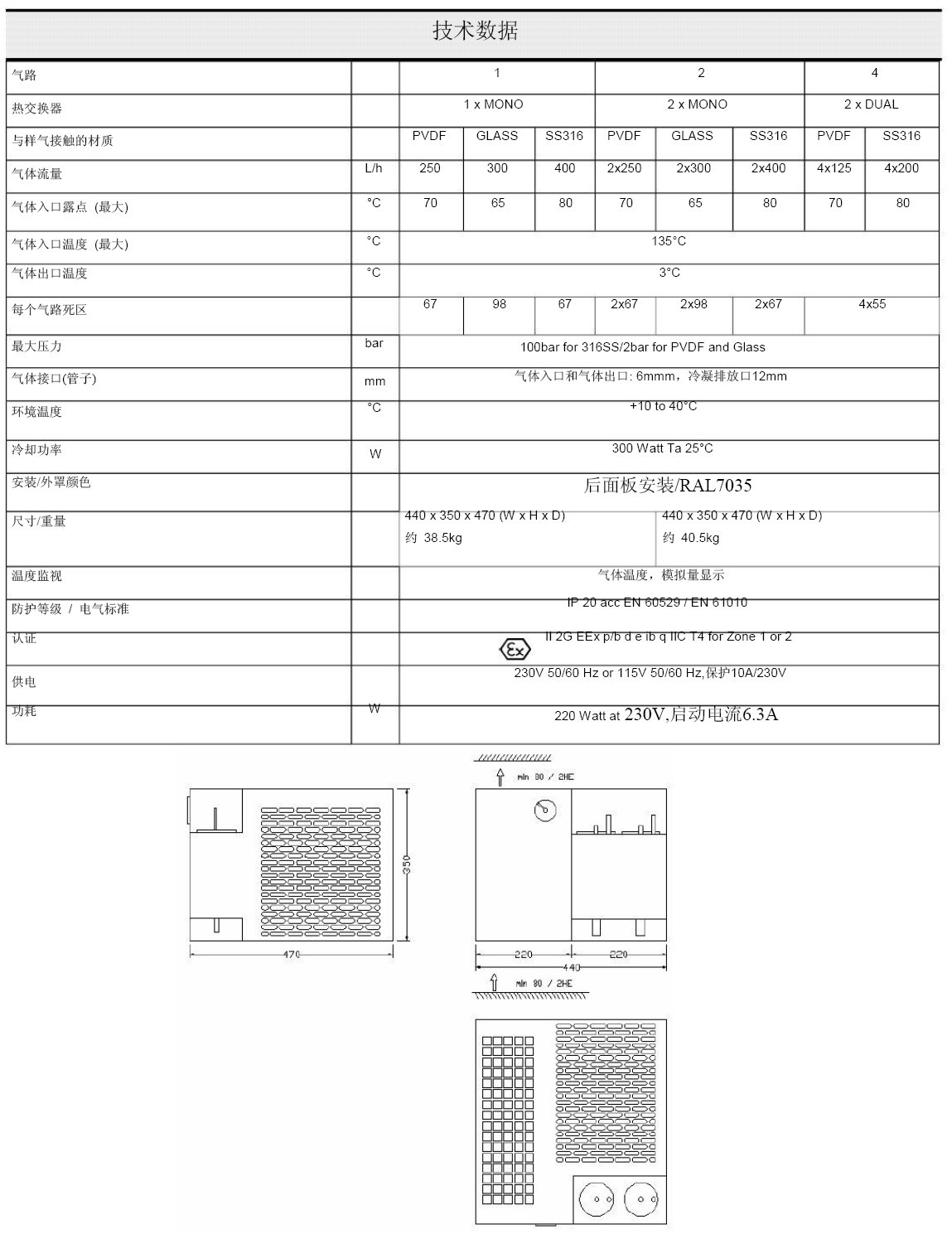 緊湊型和免維護(hù)防爆型冷凝器JCT-EX主要部件是高性能的熱交換器和精制的壓縮機(jī),用以調(diào)節(jié)冷卻系統(tǒng)。唯一的壓力和溫度控制電源調(diào)節(jié)、較高的應(yīng)用以及較好的部件,都有利于長(zhǎng)時(shí)間穩(wěn)定露點(diǎn)。熱交換器靈活的結(jié)構(gòu),允許高流量和保證樣氣和冷凝物適當(dāng)分離。JCT EX防爆型冷凝器提供穩(wěn)定可靠的技術(shù),耐腐蝕??捎糜谖kU(xiǎn)區(qū)域如1區(qū) 或 2 區(qū),通過(guò)ATEX認(rèn)證。